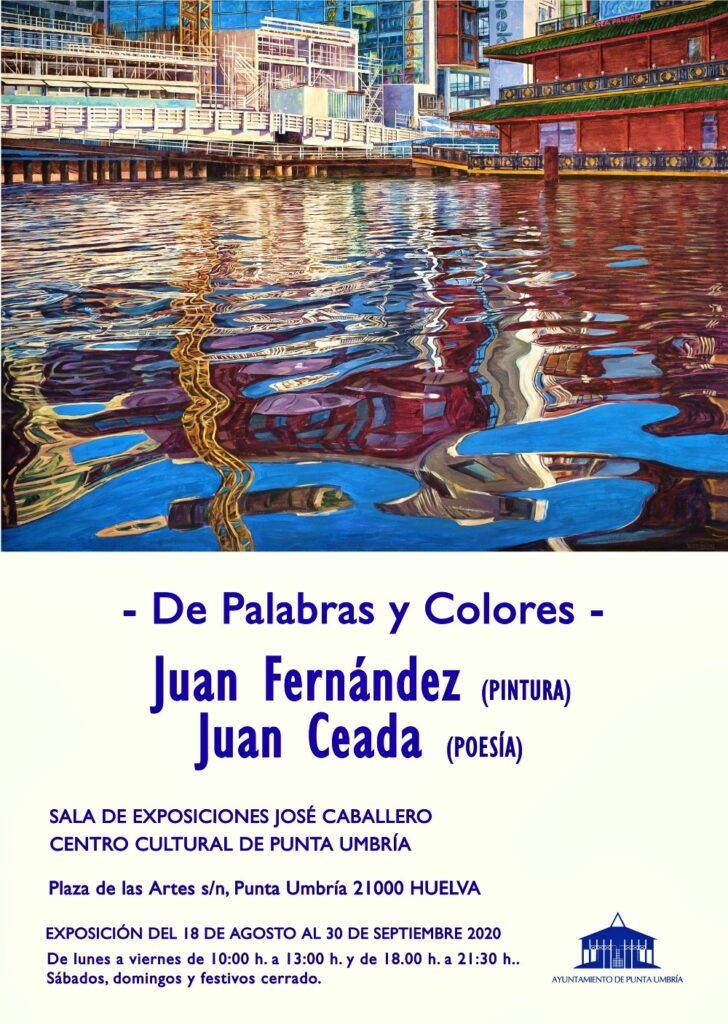 El proyecto expositivo titulado “De Palabras y Colores”, cuya idea principal es hermanar la palabra, en forma de poesía, con la plástica y el color, parte con una vocación itinerante ya que desde su primera muestra y estreno en el Museo de Huelva Mayo 2018 , visitó “La Casa del Cable” en Jávea (Alicante) , el Auditorio “Ciudad de León”, en junio de 2019 se colgó en el Ateneo de Madrid, y siguió, este mismo año, su periplo expositivo en la Casa_Museo Juan Ramón Jiménez de Moguer (Huelva) compartida con el espacio expositivo del teatro Felipe Godinez de esta ciudad, y ahora, a partir del día 18 y hasta el 30 de septiembre 2020, se podrá ver en la Sala de Exposiciones José Caballero del centro Cultural de Punta umbría en Huelva.